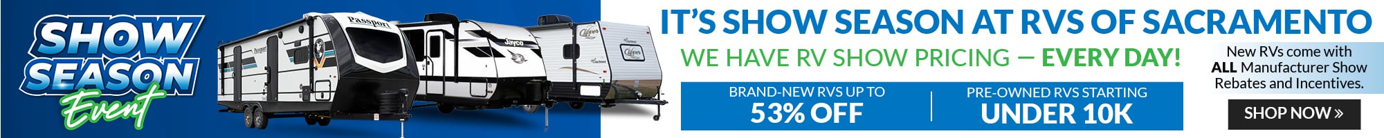 Start your RV journey with RVs of Sacramento, where adventure awaits at every turn. Our “Shop Now” page is your gateway to exploring our incredible inventory of RVs, from sleek travel trailers to spacious fifth wheels and everything in between. Whether you’re searching for a new model or a budget-friendly pre-owned option, we’ve got something for every traveler and lifestyle. Browse our selection today and find the RV that’s perfect for your next California adventure.